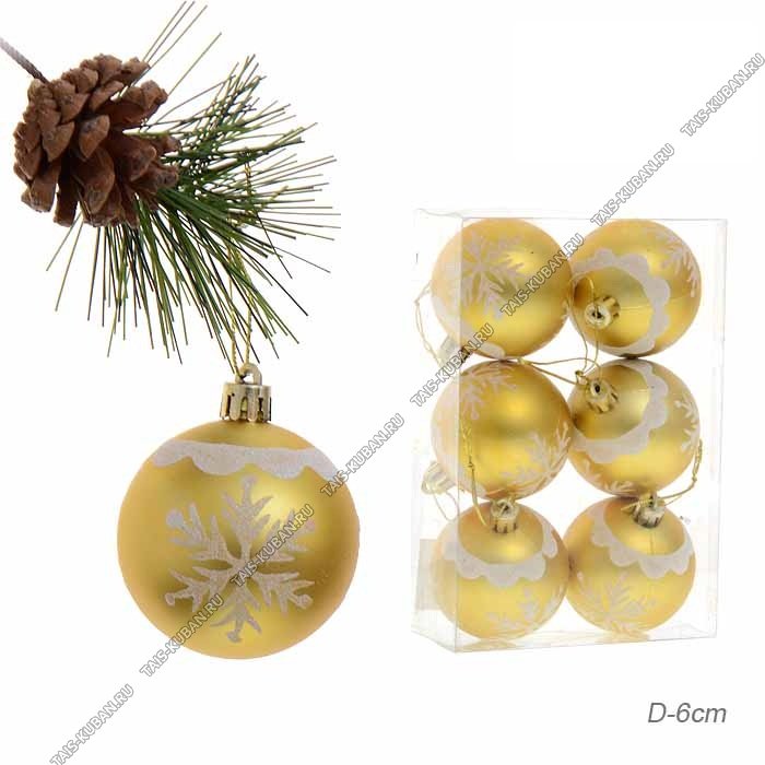 Ёлочный шар н-р 6шт d6см золото "Снежинка" пластик п/у (120)