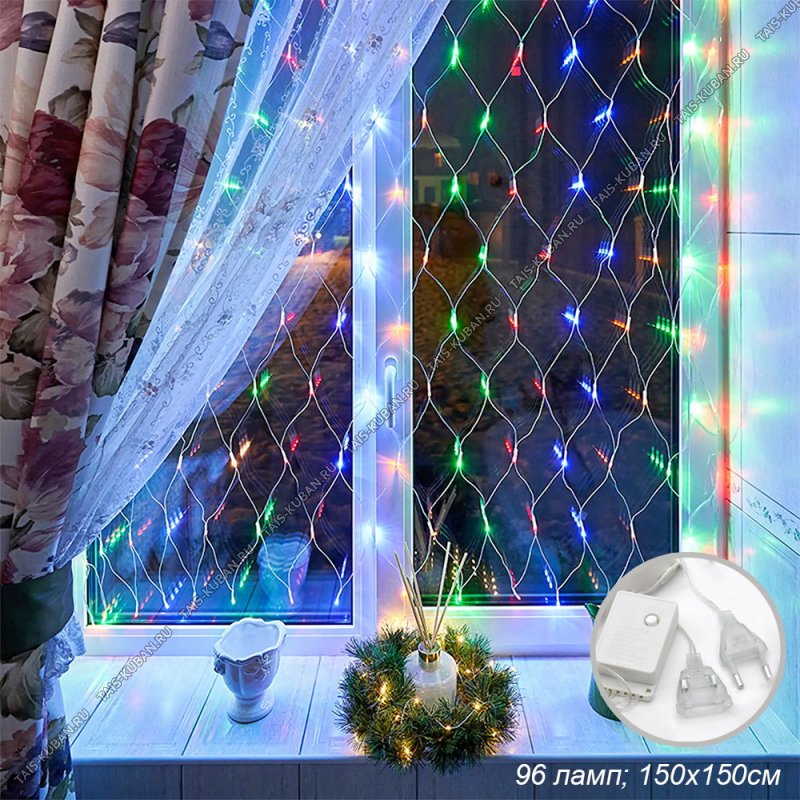 Электрогирлянда Электрогирлянда "СЕТКА" 1,5х1,5м, 96разноцв.LEDламп, 8 режим,прозр.провод,220V (100)