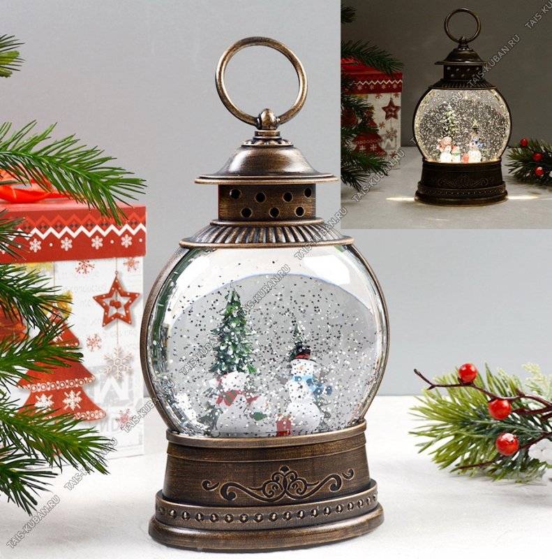 эффект "снегопада с блест", подсветка, кольцо для переноски, работает от USB и 3*АА (не в комплекте), 2режима, под бронзу
