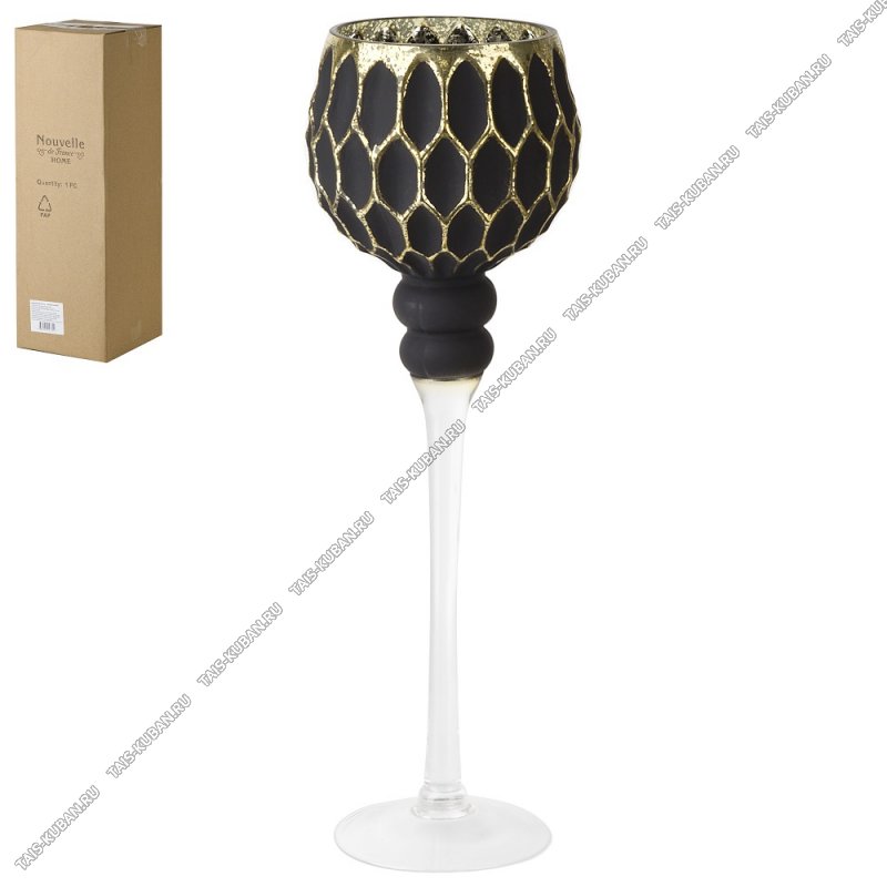 Подсвечник-бокал (стекло) на высокой ножке h40см "Massimo/Черный-золото" (чаша d10,5 h11см)