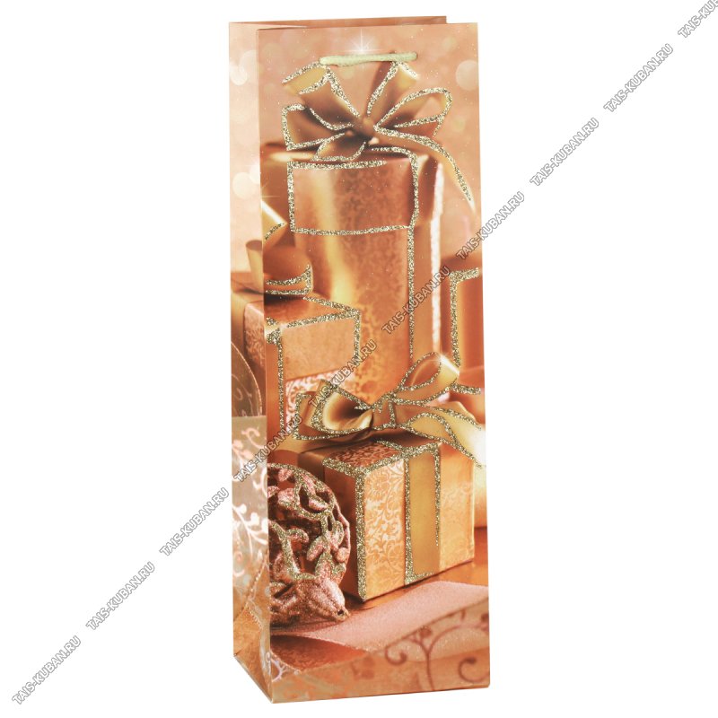 Пакет бумажный п/бутылку (h35х12см) "Золотой Новый Год/Подарки" с блестками (12)