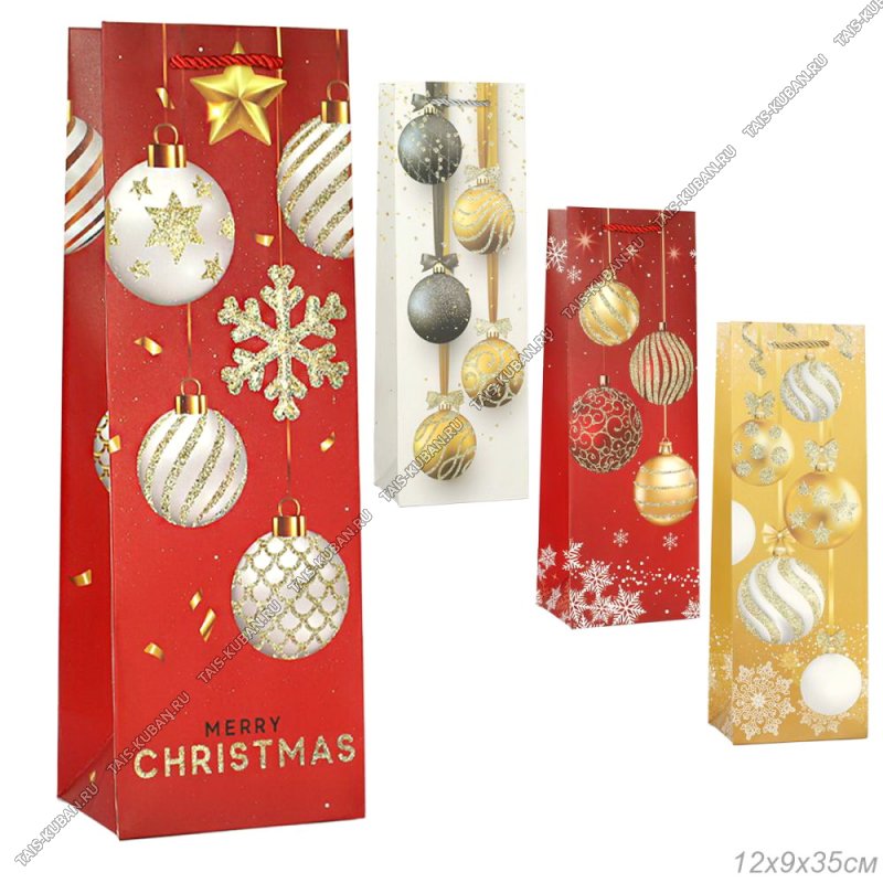 Пакет бумажный под бутылку (h35х12см) "Ёлочные шары" (12)