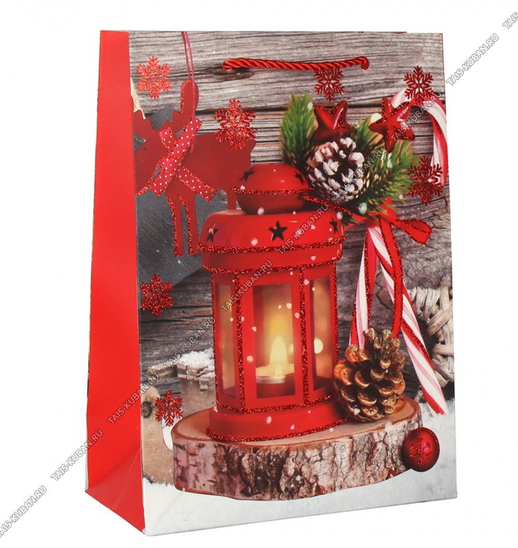 Пакет бумажный (h24х18см, дно8,5см) "Новый год/Красный фонарь" с блестками (12)