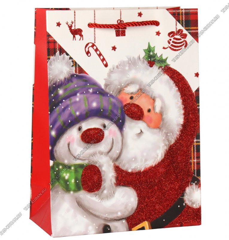 Пакет бумажный (h24х18см, дно8,5см) Пакет бумажный (h24х18см, дно8,5см) "Дед Мороз и сказка/Снеговик и олень" с блестками (12)