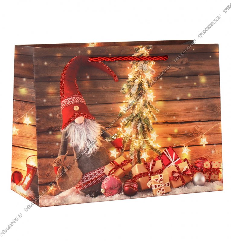 Пакет бумажный (h18х24см, дно8,5см) "Загадки Нового Года/Гномик и подарки" с блестками (12)