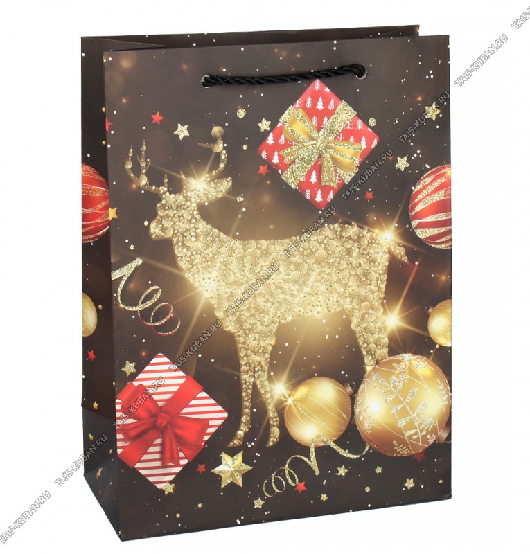 Пакет бумажный (h32х26см, дно10см) "Ночь перед Новым Годом/Золотой олень" с блестками (12)