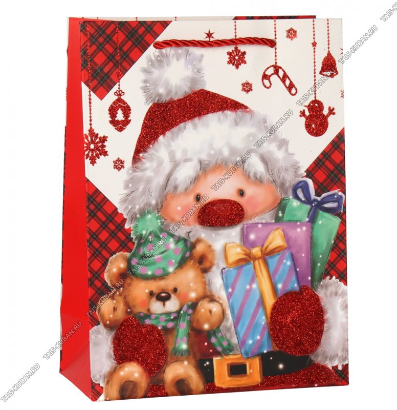 Пакет бумажный (h24х18см, дно8,5см) "Дед Мороз и сказка/Мишка и подарки" с блестками (12)