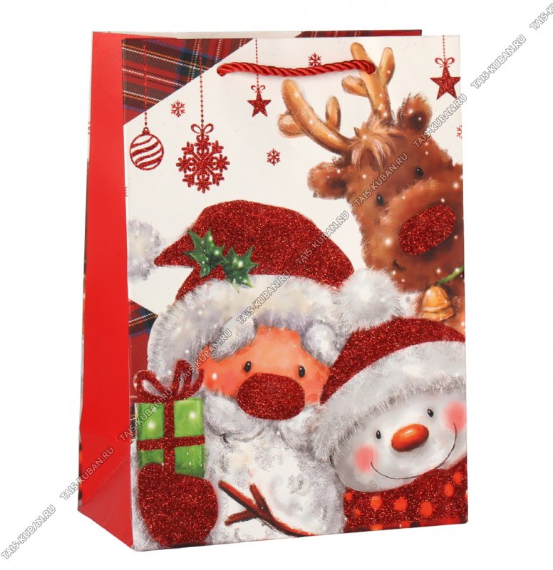 Пакет бумажный (h24х18см, дно8,5см) "Дед Мороз и сказка/Снеговик и олень" с блестками (12)