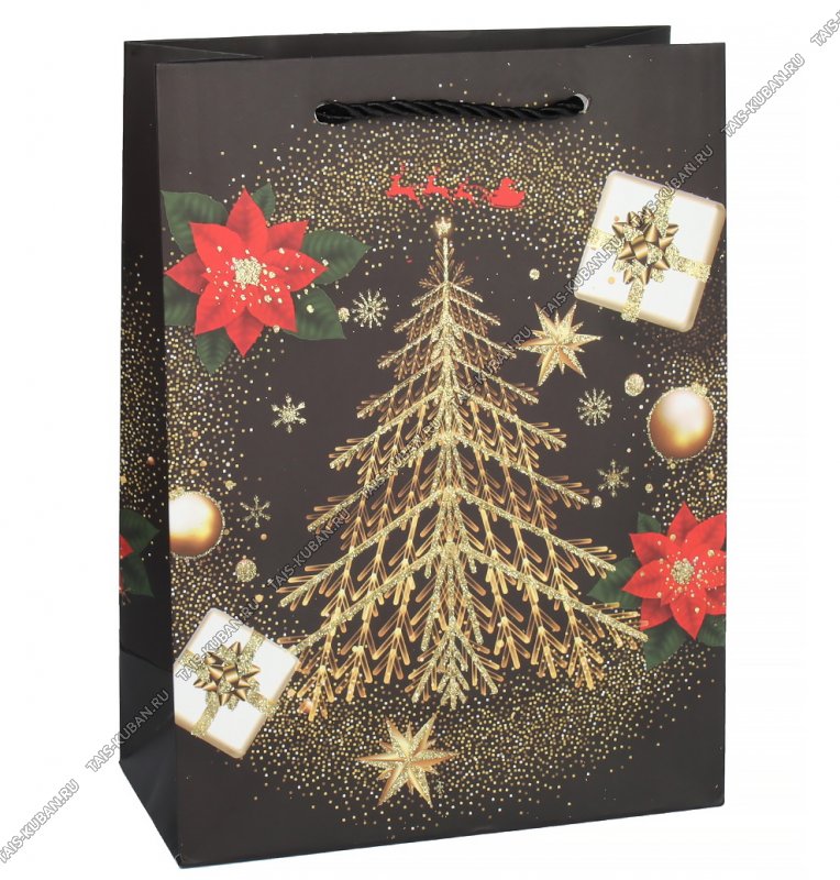Пакет бумажный (h32х26см, дно10см) "Ночь перед Новым Годом/Золотая ель" с блестками (12)
