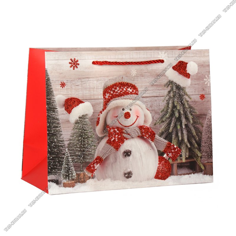Пакет бумажный (h18х24см, дно8,5см) "Подарки/Снеговик" крас/зол,с блестками (12)