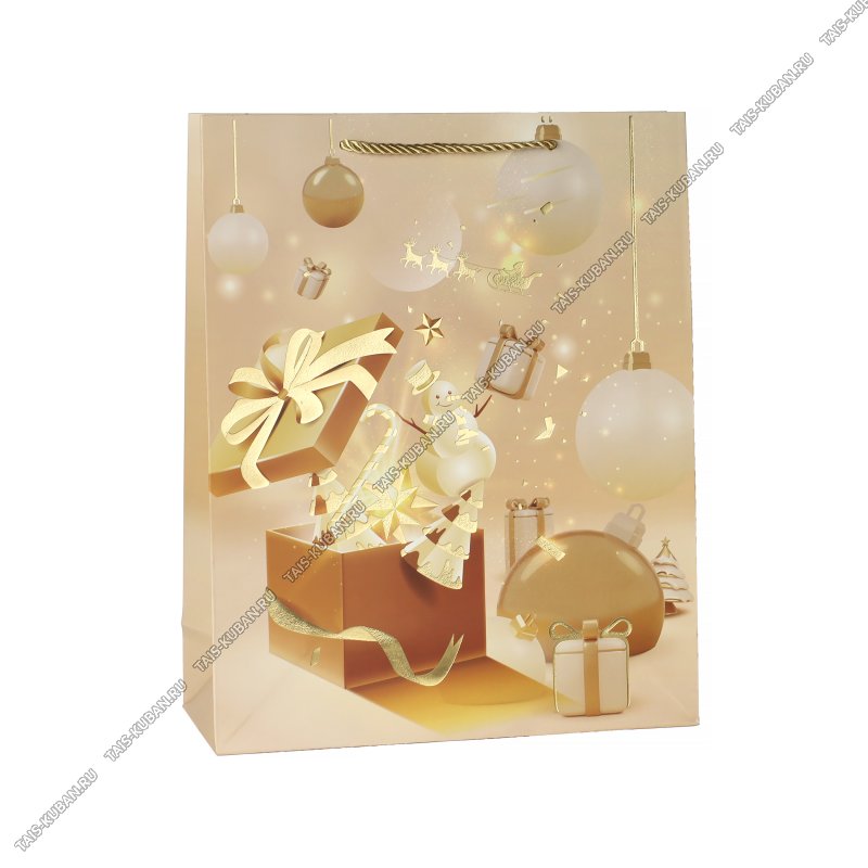 Пакет бумажный (h32х26см, дно10см) "Шары, подарки и елка/Золотой подарок" (12)