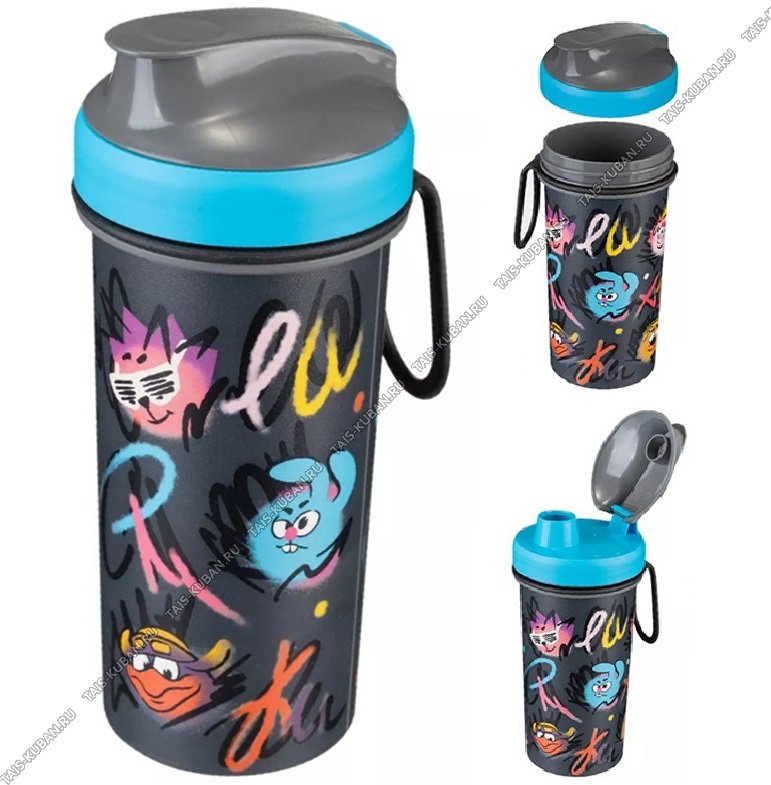 Стакан 0,4л д/холодных напитков "Смешарики" серый (d7 h16см) откидная крышка,с петлёй, Бытпласт (12)