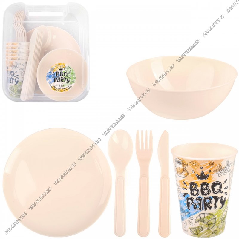Набор д/пикника 6 перс. 37пр, бежев (стак 6шт 0,3л,мис 6шт 0,55л,тар.6шт,вил 6шт,лож 6шт,нож 6шт) контейнер, Idi Land (24)
