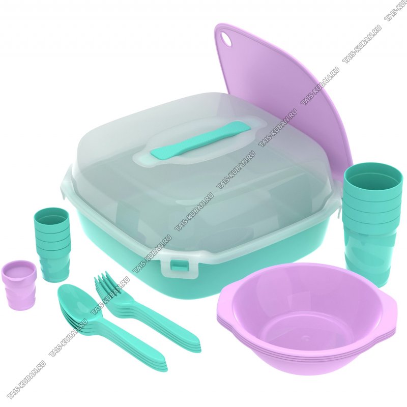 Набор д/пикника 4 перс. 23пр, бирюза+сирень (стаканы 0,25л 4шт,вил 4шт,ложка 4шт,тар.глуб 0,7л 4ш, доска.раздел, стопка 0,10 4шт,солонка 1шт,контейнер 9л) Альт Пласт (6)