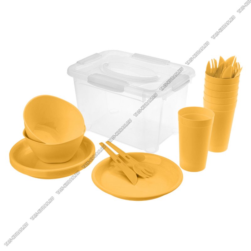Набор д/пикника 6 перс. 27пр,желтый (стак. 0,38л 6шт,вил 6шт,нож 6шт,тар.6шт,миски 2шт. 0,5л, контейнер с.крыш.и замк.) Бытпласт (8)