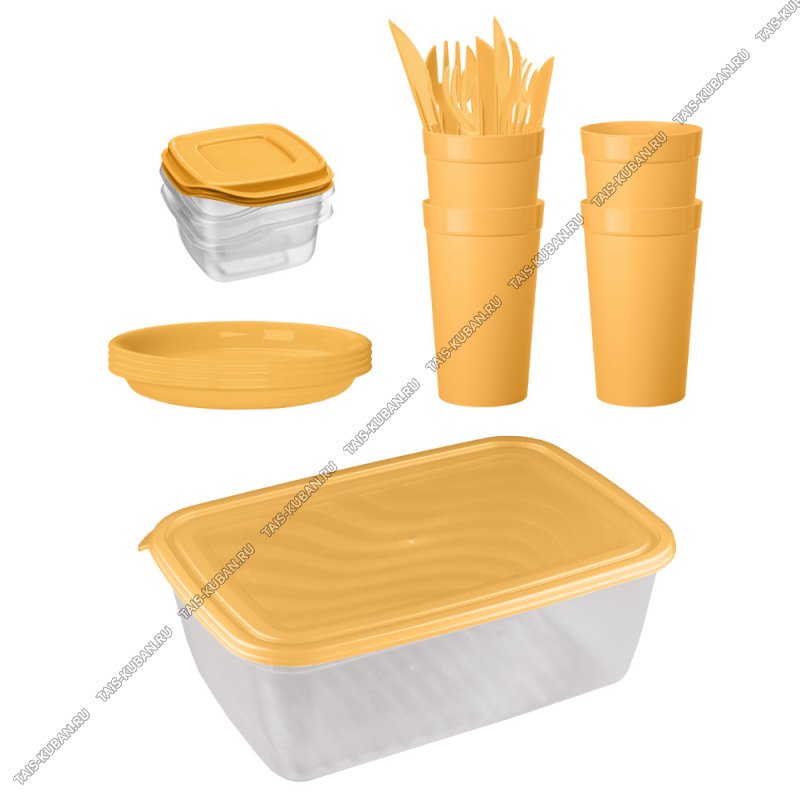 Набор д/пикника 4 перс. 19пр,желтый (стак. 0,4л 4шт,тар.4шт,вилк 4шт,нож 4шт,контейн 0,12л 2шт,салатник с крыш.4л) Бытпласт (12)