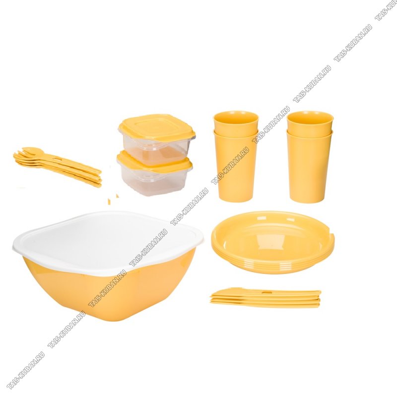 Набор для пикника 4 персоны, 19 предметов,желтый (стакан 0,4л 4шт,тарелка 4шт,вилка 4шт,нож 4шт,контейнер 2шт,салатник с крышкой 4,5л) (6)