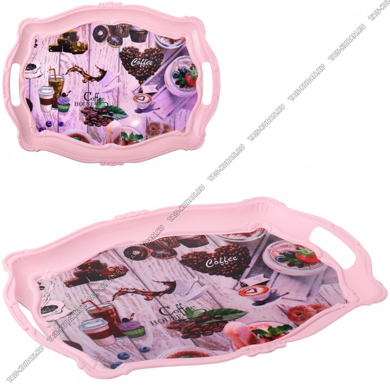 Поднос прям.(38,5х29 h2,5см) "Кофе" фигурн. борт,вырубн.ручк,розов (100)