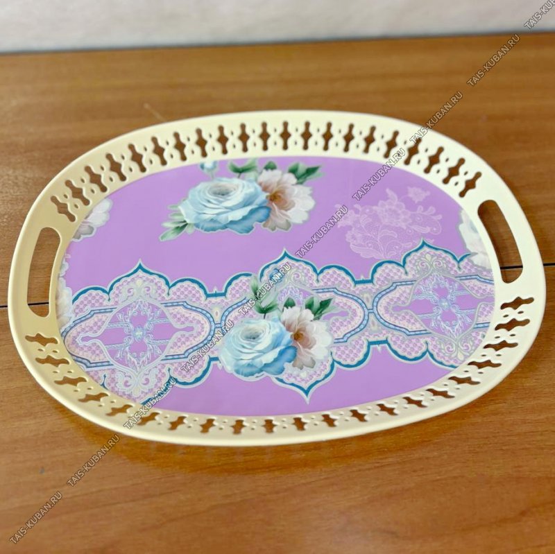 Поднос овал.(34х24 h4см) "Цветы" резной борт,вырубн.ручк,крем/сирен (200)