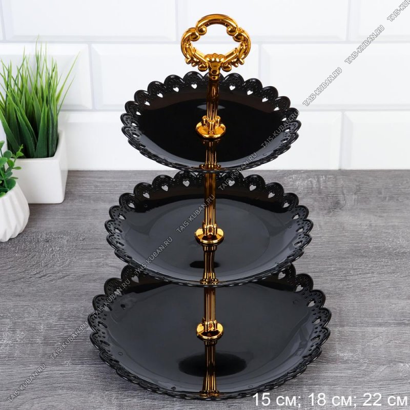 Фруктовница 3-х яр, кругл (d15/18/22 h35см) "Кружево/Черный" резной край,золот.кркплен (100)