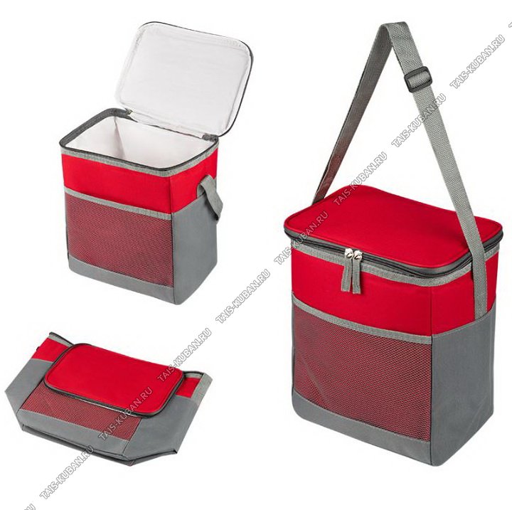 Цвет - красный/серый. Материал 600D полиэстер. Теплоизолирующий слой: ПЕВА+РЕ, наружый карман-сетка, плечевой ремень