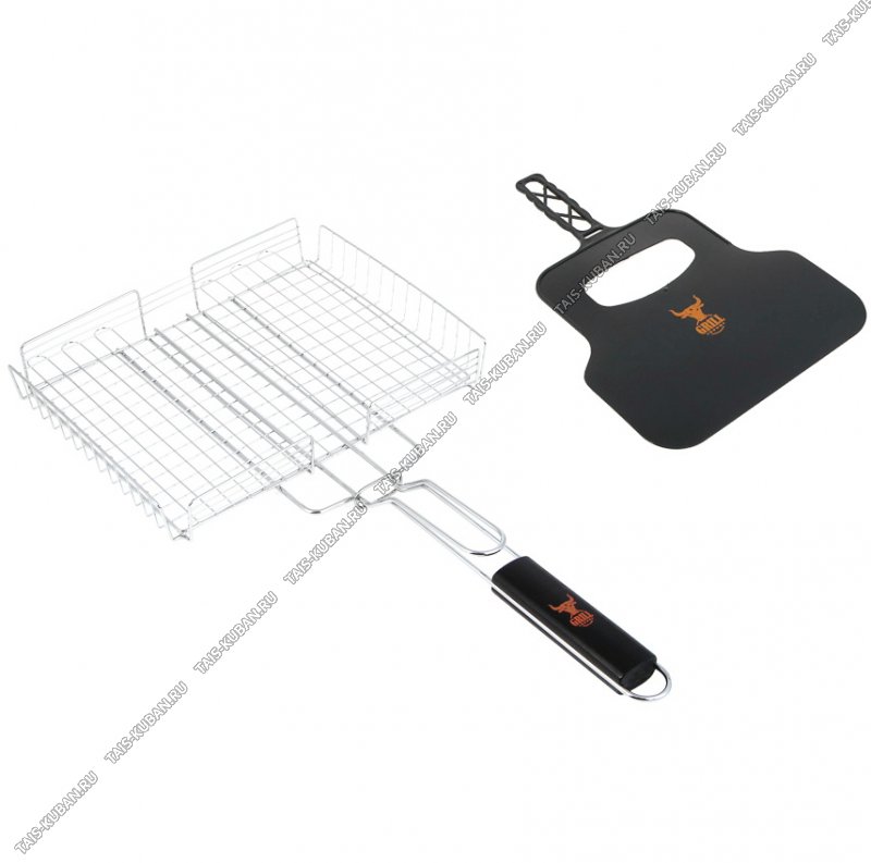 Решетка глубокая 56х30х4см +веер для раздува мангала 20х30см, деревянная ручка, хромированная сталь GRILLBOOM
